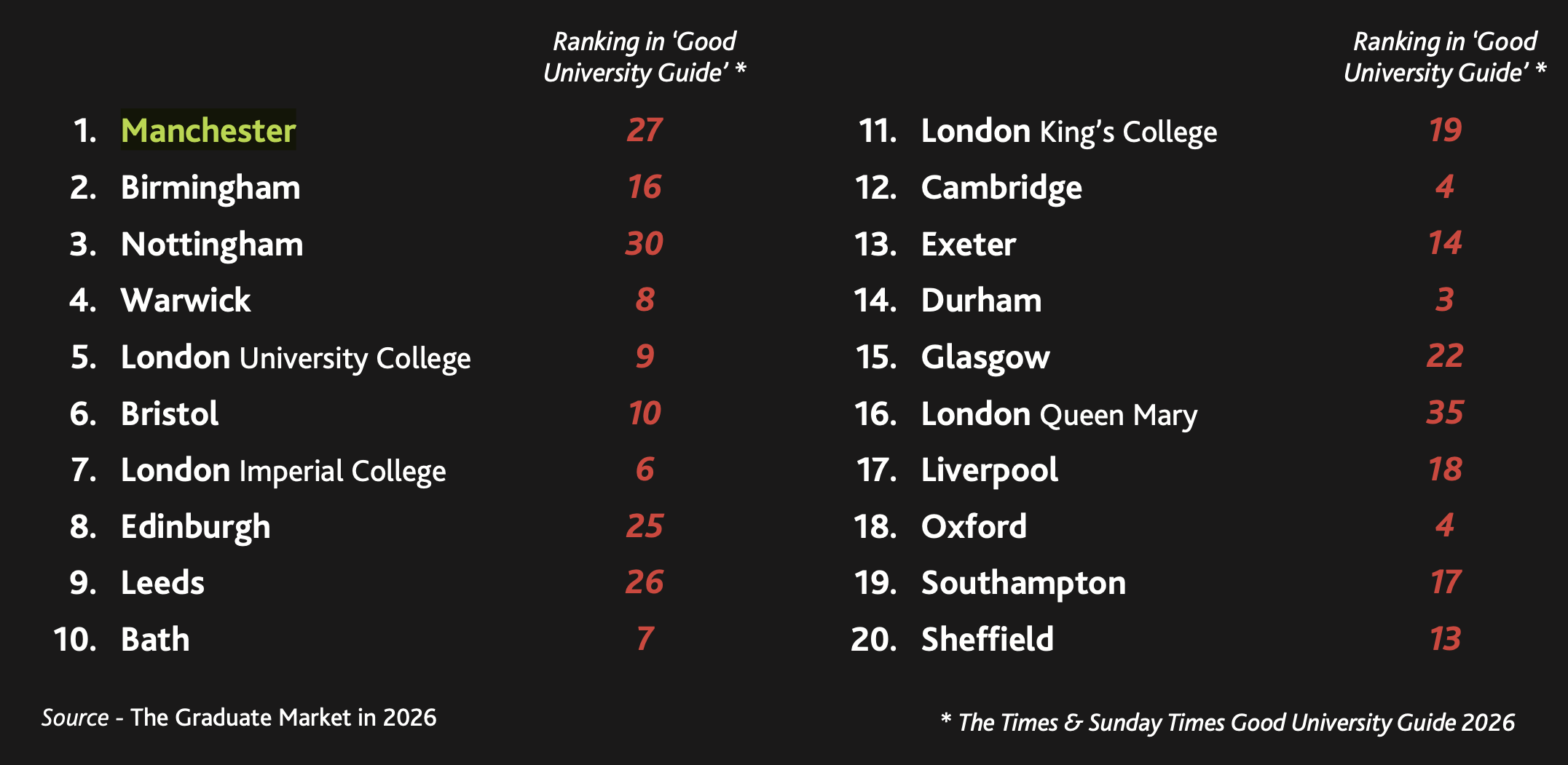 Our students, staff and alumni work with a wide range of employers from local startups through to global corporations, and everything in between. According to highfliers.co.uk, the University of Manchester is the most targeted University in the UK by the Times Top 100 Graduate Employers, (Birchall 2026) this is reflected in the quantity and diversity of organisations we collaborate with.