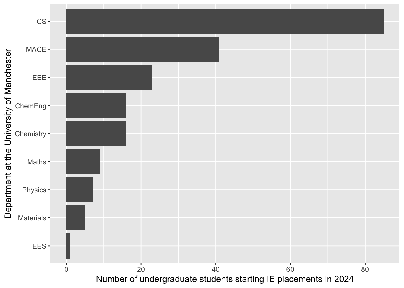 CS: Department of Computer Science cs.manchester.ac.uk, MACE: Department of Mechanical, Aerospace and Civil Engineering (MACE) mace.manchester.ac.uk, EEE: Department of Electrical and Electronic Engineering eee.manchester.ac.uk, ChemEng: Department of Chemical Engineering ce.manchester.ac.uk, Chemistry: Department of Chemistry chemistry.manchester.ac.uk, Maths: Department of Mathematics maths.manchester.ac.uk, Physics: Department of Physics & Astronomy physics.manchester.ac.uk, Materials: Department of Materials materials.manchester.ac.uk, EES: Department of Earth and Environmental Sciences ees.manchester.ac.uk. Data from PowerBI as of 2025, note that summer internships are shown in this bar chart, only year long placements. Data from app.powerbi.com